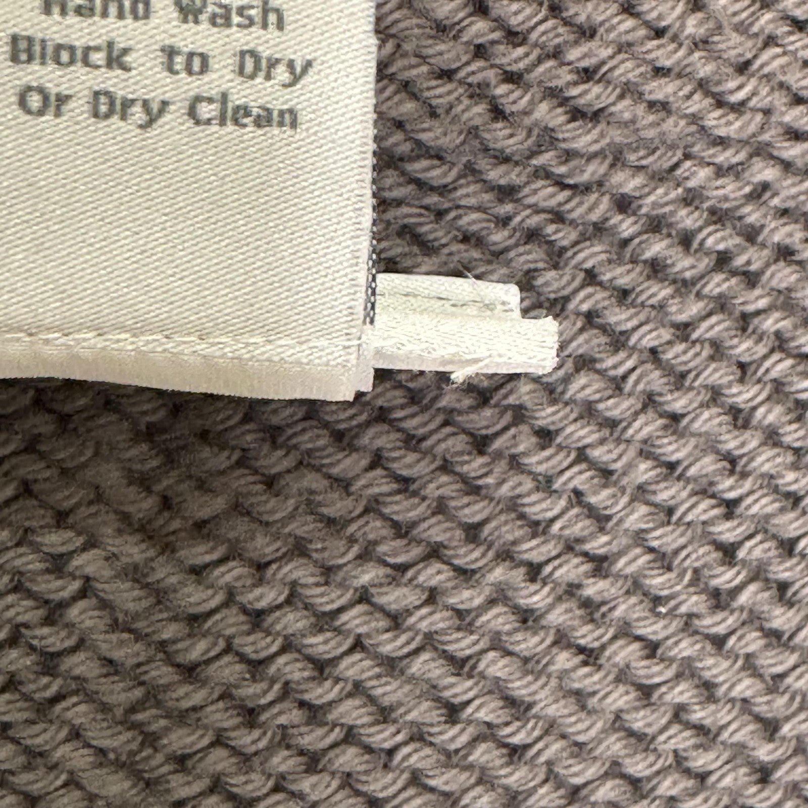 Design details: Button-front with mixed/embellished buttons (mother-of-pearl, faceted, jeweled), crochet/ruffle knit trim at hem and cuffs, piped neckline, decorative button at upper back, long sleeves